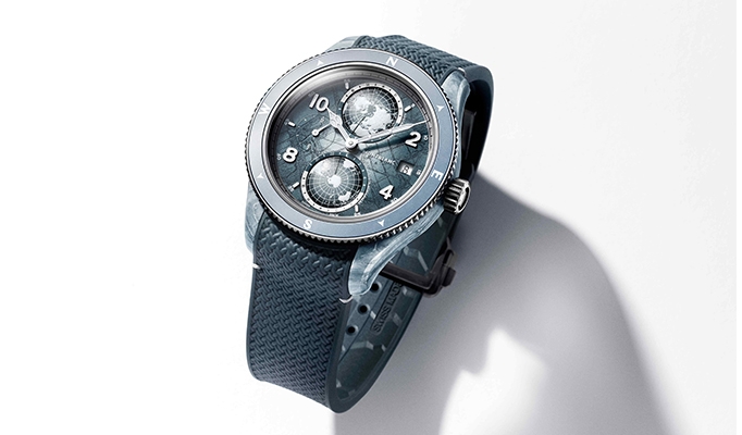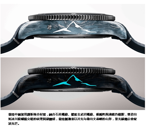 這個冰雪主題延續到錶盤上,錶盤飾有藍綠色和淺灰色暈染冰川圖案,採用一種名為「gratté-boisé」的古老特殊工藝製作,使錶盤呈現豐富的層次感和亮麗的光澤;這個耗時的工序需要的時間是標準錶盤的四倍,經歷超過30個獨立的步驟才能完成。淺灰色陽極氧化鋁金屬錶圈搭配藍色夜光羅盤方位,令錶盤更精緻奪目。