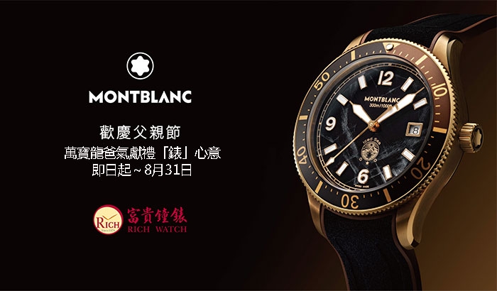 歡慶父親節,富貴鐘錶+MONTBLANC特別舉辦「萬寶龍爸氣獻禮錶心意」活動,即日起至8月31日,凡到富貴鐘錶旗艦店或中正店購買任一萬寶龍腕錶,即可獲贈萬寶龍自動折疊傘一支,數量有限,送完為止,動作要快喔!